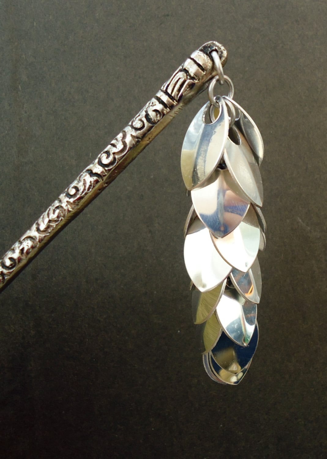 Shiny. Jingly. Lightweight. These scales are made from highly polished aluminum, which makes them very lightweight and non-tarnishing. They are arranged in a free-falling pattern which makes them jingle a little when they move. The silver scales cascade down just over three inches and are available in several hair stick options.