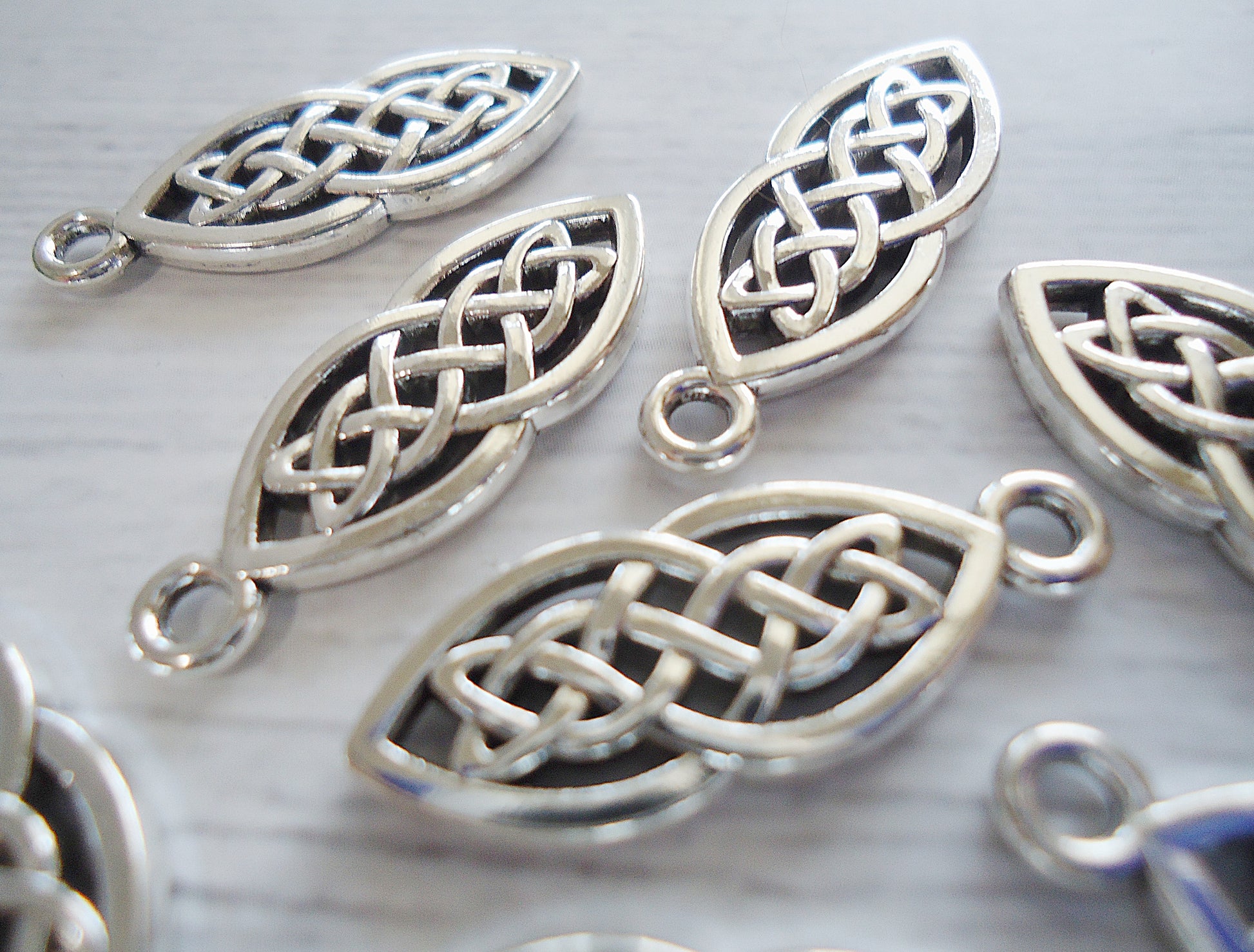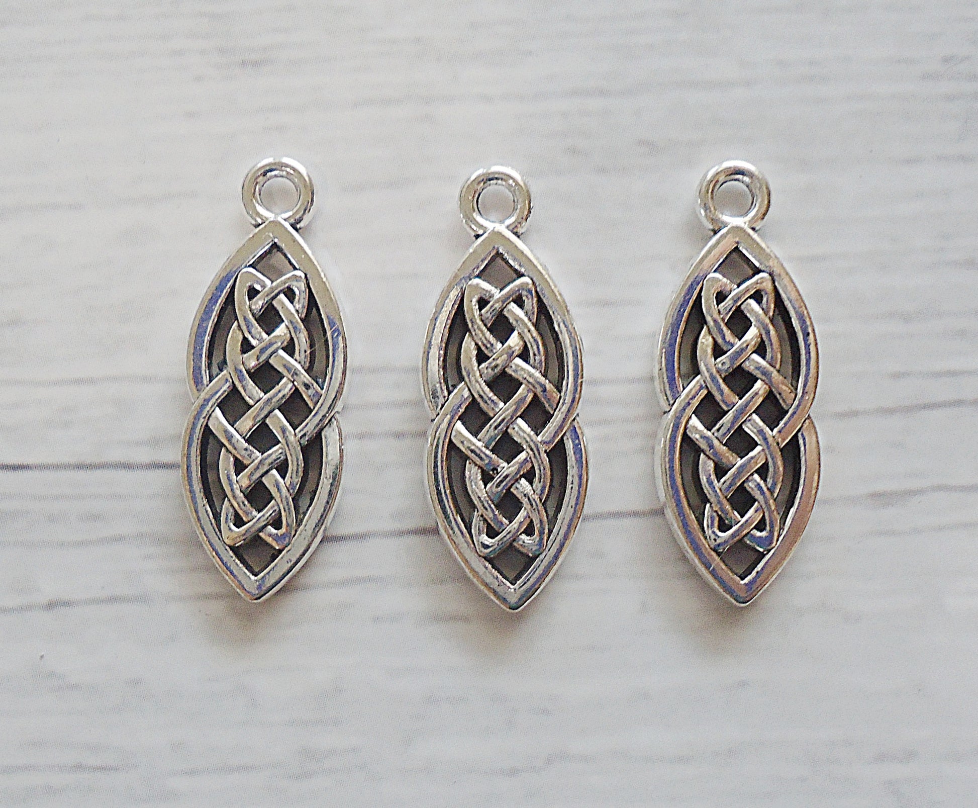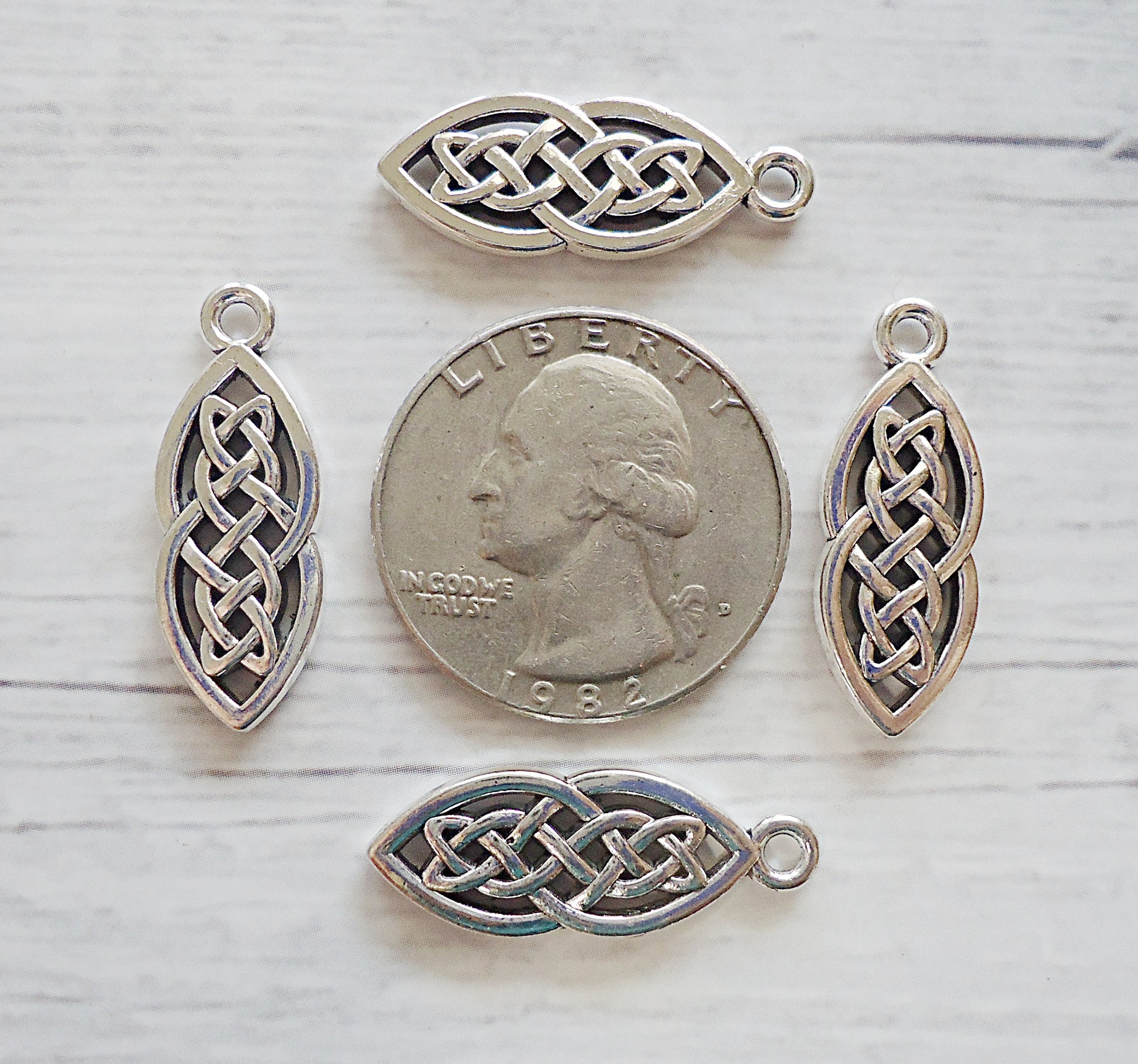 Double interlocking Celtic knot patterns form this 1-inch tall silver finished charm. Versatile for jewelry making, crafting, and decorative applications. Works for earrings, necklaces, keychains, and more. Ten charms are included.