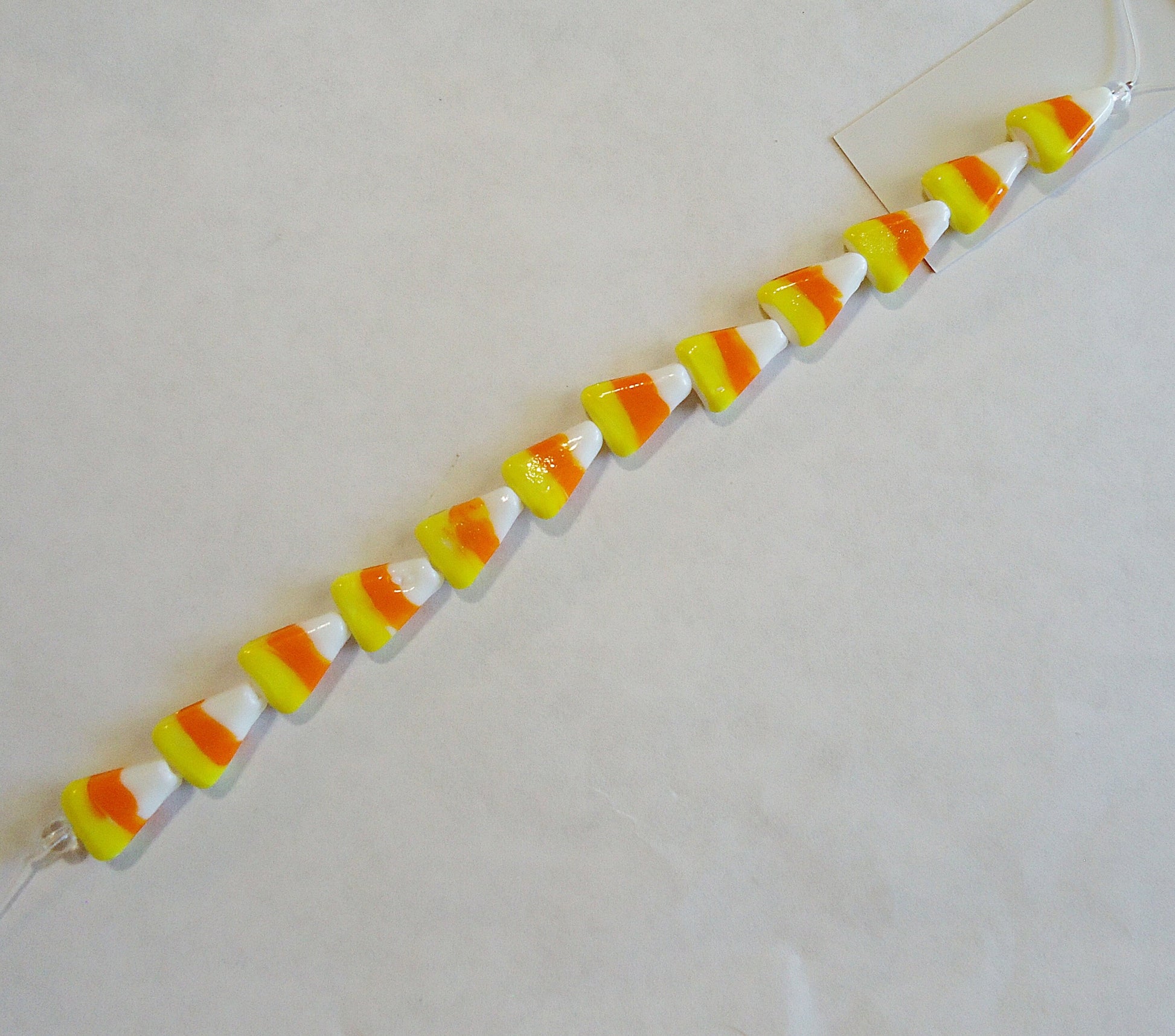 Beautiful Glass Candy Corn Beads! Each bead is approximately 15mm Tall x 11 mm Wide x 4mm Thick. 12 Beads are included. Enough to make a bracelet and a pair of matching earrings!