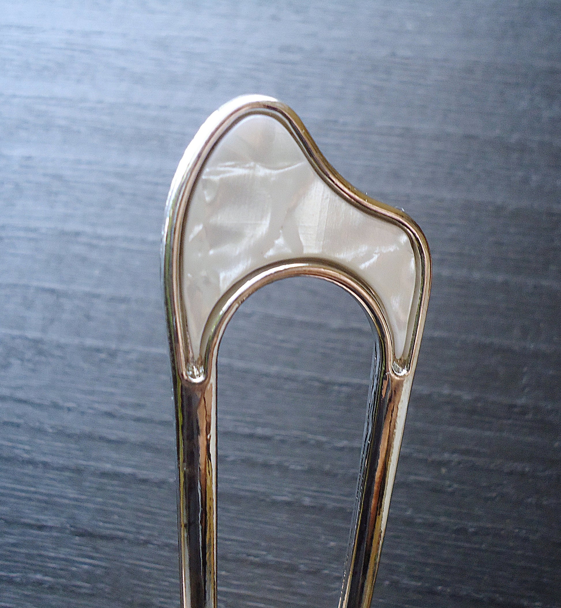 These hair sticks feature a Mother of Pearl Shell atop a 2-pronged metal alloy hair stick, in either Silver or Gold. It is 1" Wide at the widest part, and the whole piece has a slight curve to it to hold your hair a little tighter than a straight stick. The Wavy Style is 4.25" Long and the Horseshoe Style is 4" Long.