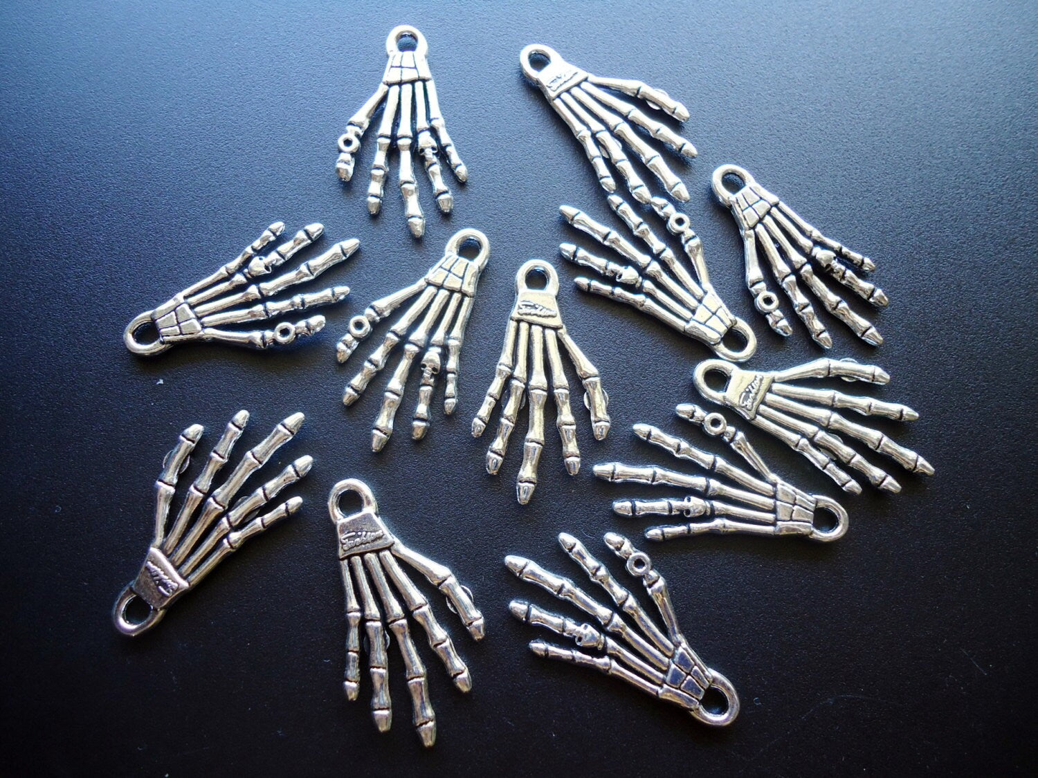 Skeleton Hand Pendants / Charms - Antique Silver - Set of 10 - Halloween Accessory